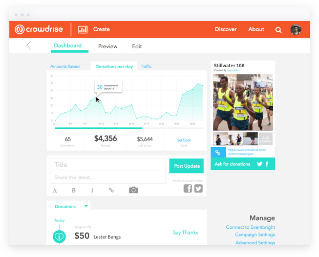 Your Event Dashboard will give you stunning, relevant, real-time data and analytics. Your dashboard gives you and your team a complete overview of your event’s performance, so you can make smart, timely decisions to drive more participation and raise more money for your causes.